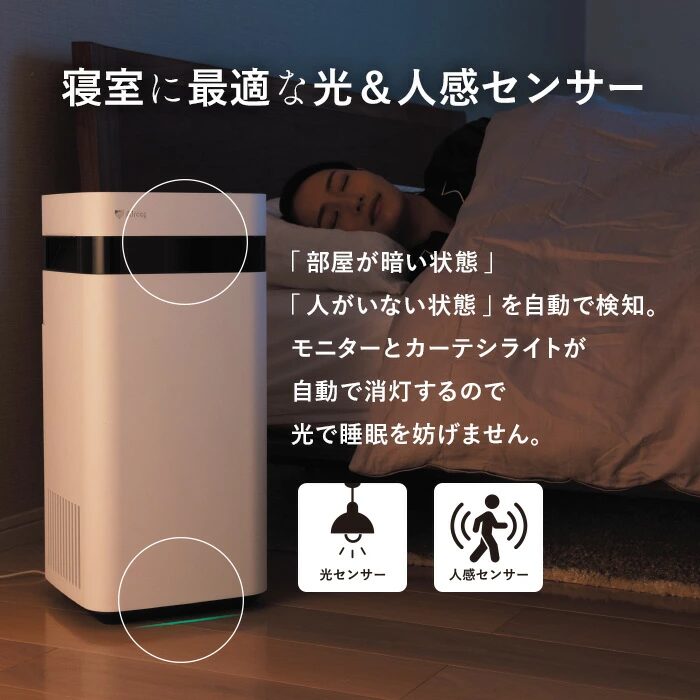 ╲寝室の空気を、静かに守る。光センサーで睡眠を妨げない/