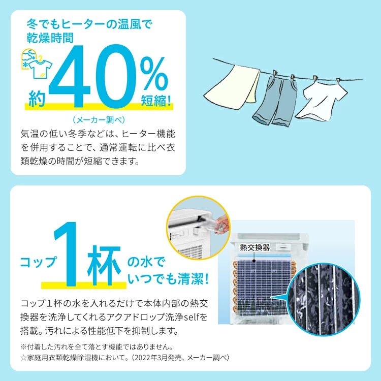 除湿機の内部汚れが気になっていた方には、この「アクアドロップ洗浄self」は特に注目してほしい機能。コップ1杯の水で自動洗浄できるのは、他のメーカーにはなかなかない強みです。