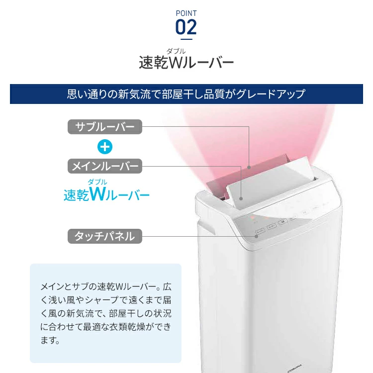 コロナ独自の「速乾Wルーバー」は、上下と左右の2方向に自動で風向きを変える機能です。