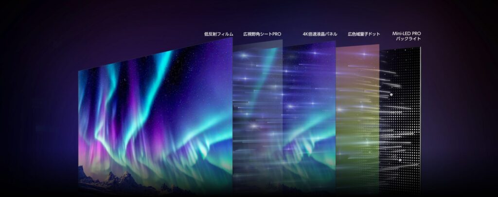 E80Rは「Mini-LED PRO」と「広視野角パネルPRO」を搭載しており、3モデルの中で最高峰の画質性能を誇ります。