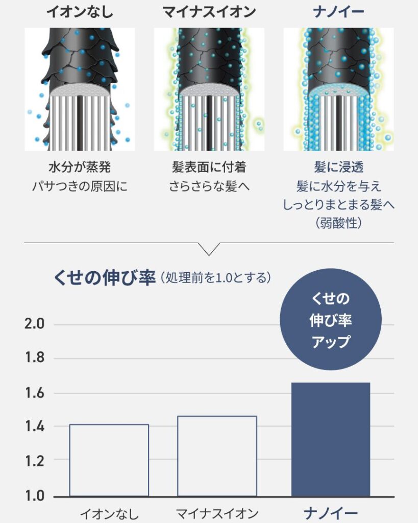 ナノイーとは、空気中の水分を微細化した水分たっぷりのイオンのことで、キューティクルに浸透して髪のうねりを抑制し、なめらかな指通りへ導いてくれます。