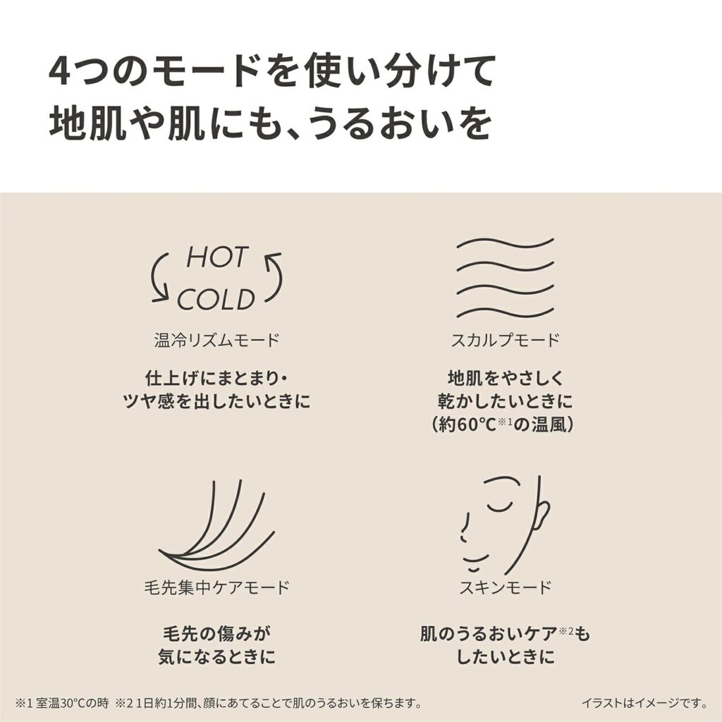 両モデルとも、温冷リズムモード、毛先集中ケアモード、スカルプモード、スキンモードの4つのモードを搭載しています。