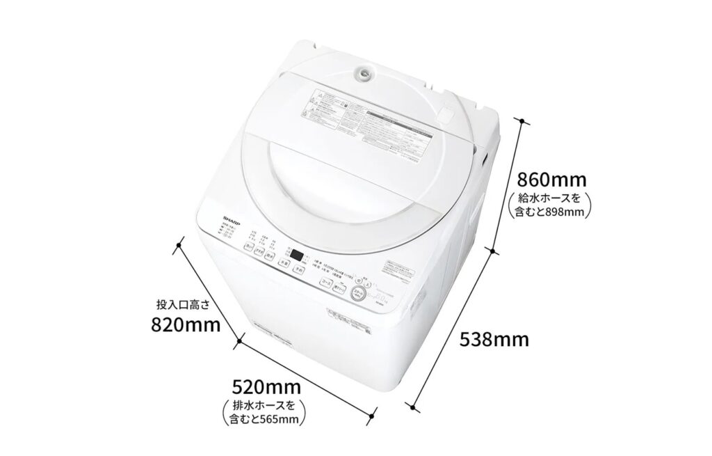 外形寸法は565×538×898mm、質量は約32kgとコンパクトながら、洗濯・脱水容量は6kgと日常使いには十分なサイズです。