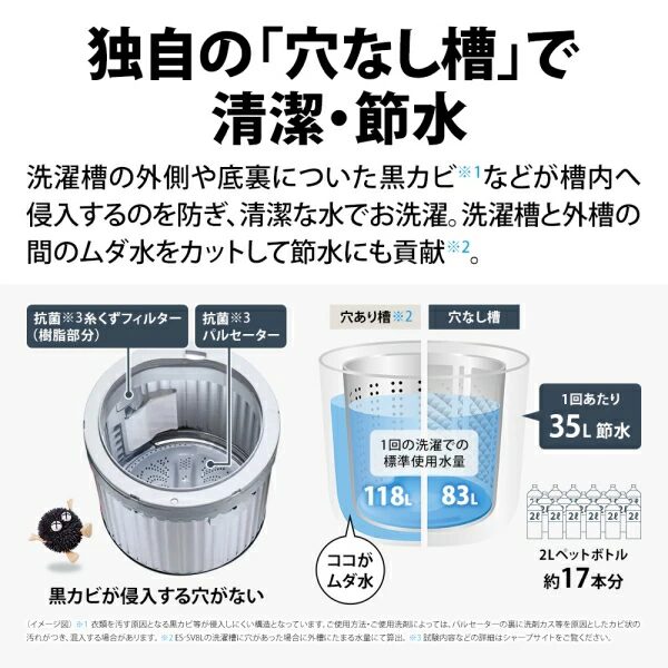 一般的な縦型洗濯機とは違って、洗濯槽の側面に穴がない構造になっているため、槽の外側の黒カビや汚れが中に入りにくく、きれいな水で洗いやすいのが魅力です。