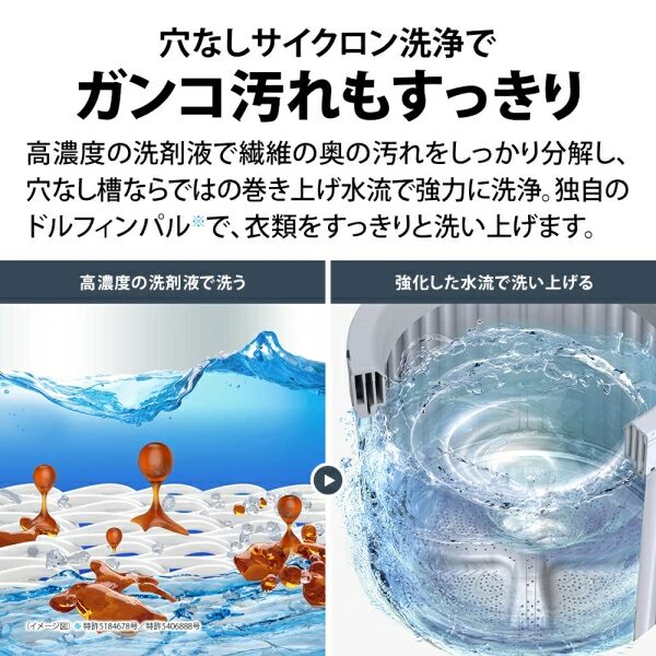 どちらも、穴なし槽・穴なしサイクロン洗浄・液体洗剤と柔軟剤の自動投入・大きな開口部・ほぐし運転など、毎日の洗濯をラクにする基本機能はしっかり共通しています。