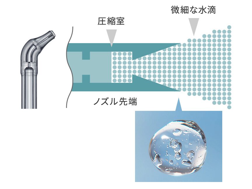 水流の強さや勢いではなく、水滴と気泡が弾ける力で汚れを洗い落とすのが特徴です。