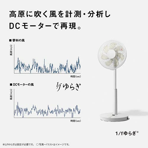 細かい風速制御が可能なDCモーターだからこそ実現した、不規則で強弱のある自然に吹くような風が「1/fゆらぎの風」です。
