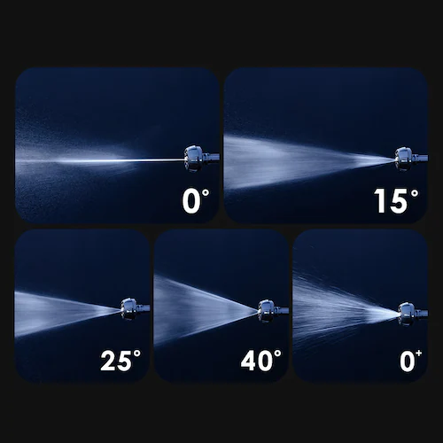5in1ノズルは5種類の噴射パターンに切り替えが可能で、汚れの種類や場所に応じて使い分けられます。