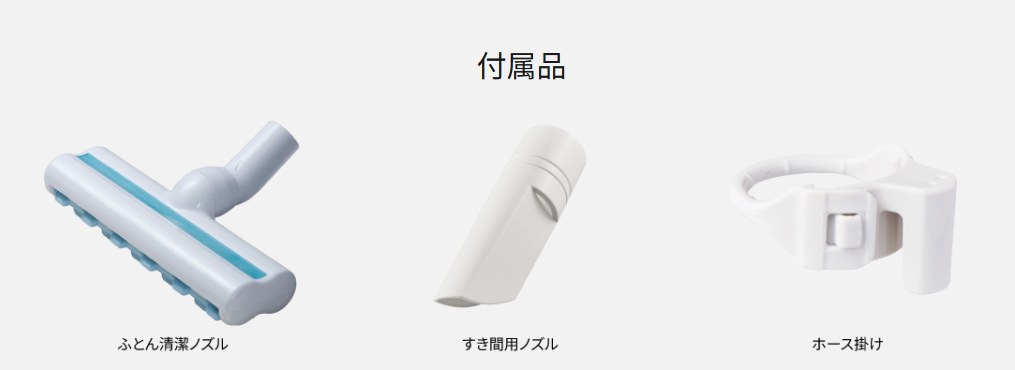 付属品 | ワンタッチ手元ブラシ、ふとん清潔ノズル、すき間用ノズル | ワンタッチ手元ブラシ、ふとん清潔ノズル、すき間用ノズル、ホース掛け |