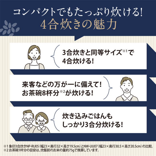 1人分や2人分の少量でも、ムラなくおいしく炊き上げられるため、夫婦2人暮らしや一人暮らしの方にも最適です。