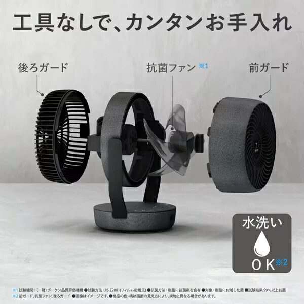 A. 前ガード・ファン(羽根)・後ろガードの3パーツが工具不要で取り外し可能で、水洗いできます。本体(モーター部分)は水洗い不可です。洗った後は十分に乾燥させてから取り付けてください。