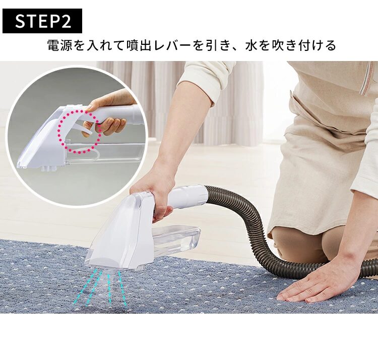 水を吹きかけて汚れを浮かせ、吸引するだけの簡単な3ステップで、誰でも手軽に使えます。