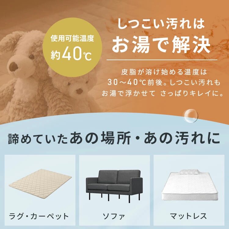 両モデルとも、水だけでカーペットやソファ、車のシートなどを洗浄できます。
