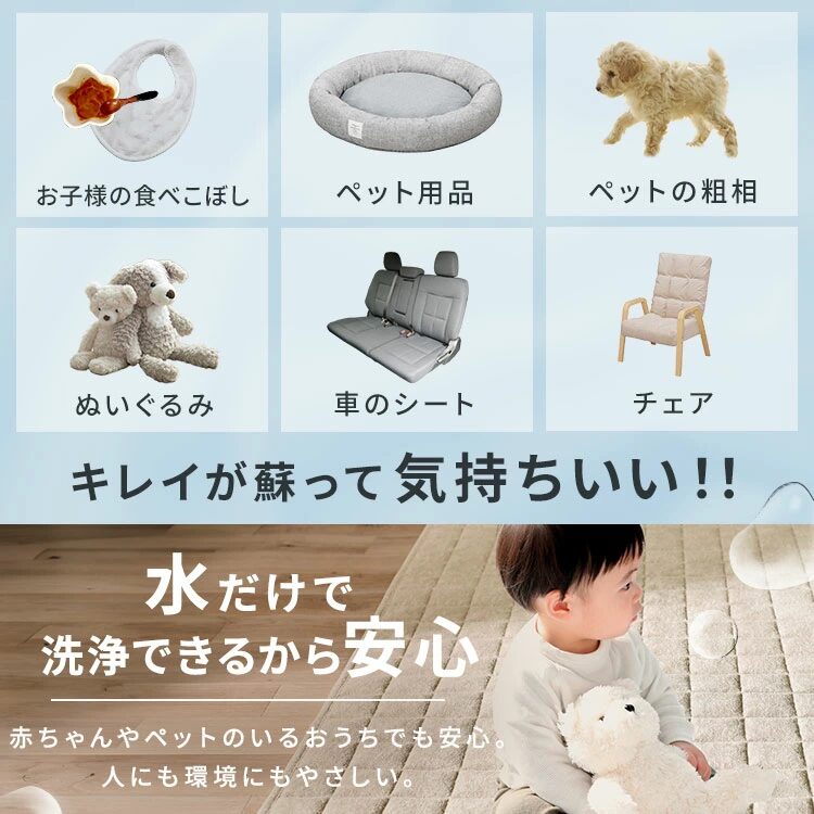 洗剤を使わないため、ペットや小さなお子様がいる家庭でも安心して使えます。また、洗剤代がかからず経済的です。