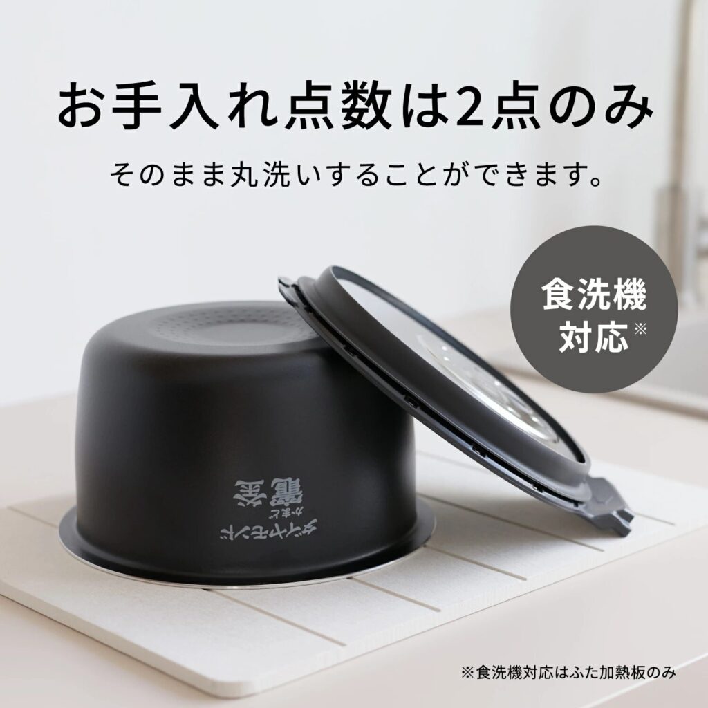 ふた加熱板はワンタッチで外れ、食洗機対応・丸洗いOK。