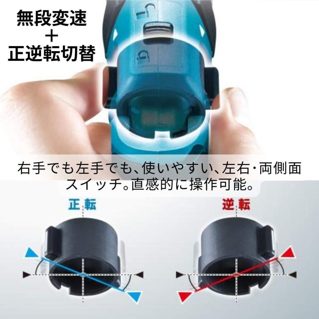 親指一本で正逆を切り替えられるため、作業効率が向上します。楽天レビューでも「正逆スイッチは慣れれば問題無し」という声が多く、一度慣れてしまえば非常に便利な機能です。