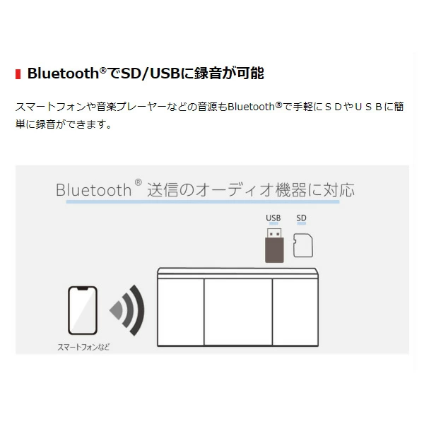 - Bluetooth受信音源のSD/USB録音機能の有無