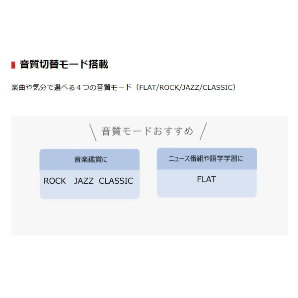 4つの音質モード(FLAT/ROCK/JAZZ/CLASSIC)を搭載しており、音楽ジャンルや気分に合わせて最適な音質を選べます。
